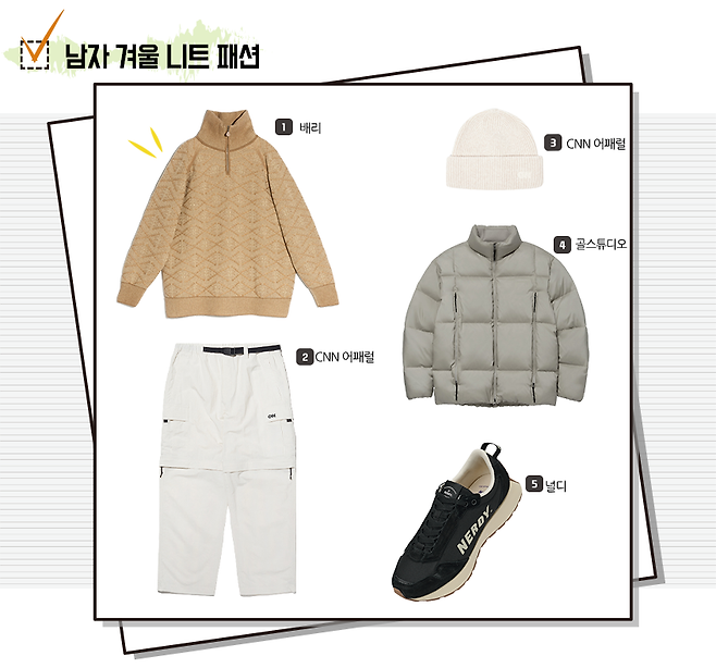 반집업 니트에 카고팬츠, 비니, 숏패딩으로