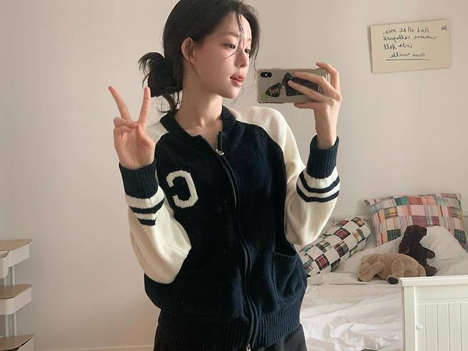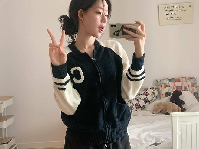 이번 스타일링의 핵심은 클래식한 바시티(Varsity) 디자인을 니트 소재로 풀어내어 포근함과 활동성을 동시에 잡은 데 있습니다.