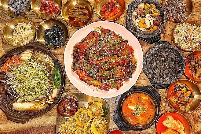 18가지가 넘는 반찬과 국, 찌개, 제육볶음, 생선구이까지 가득 차려지는 한상은 양도 푸짐해 만족도가 높습니다. 매일 새벽부터 당일 먹을 음식만 만들어 제공하므로 신선함이 살아 있고, 단체 모임에도 잘 어울리는 분위기입니다.