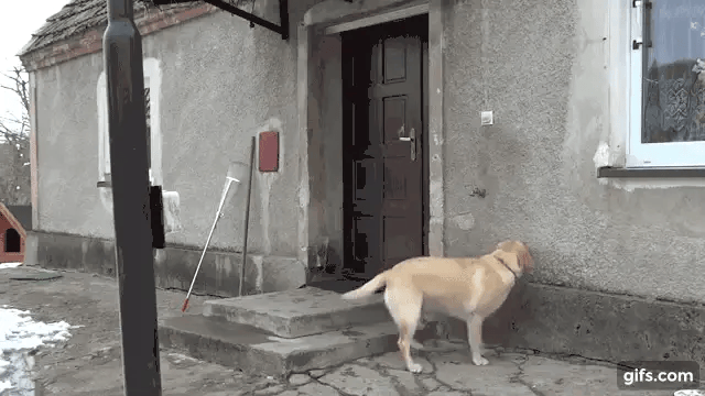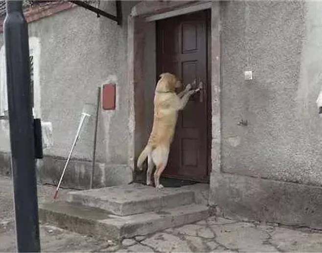 주인 몰래 밖으로 나가 신나게 놀고 돌아온 리트리버 루시는 기분 좋게 집 앞으로 달려왔습니다. 평소처럼 앞발을 들어 익숙하게 문손잡이를 돌려보았죠.