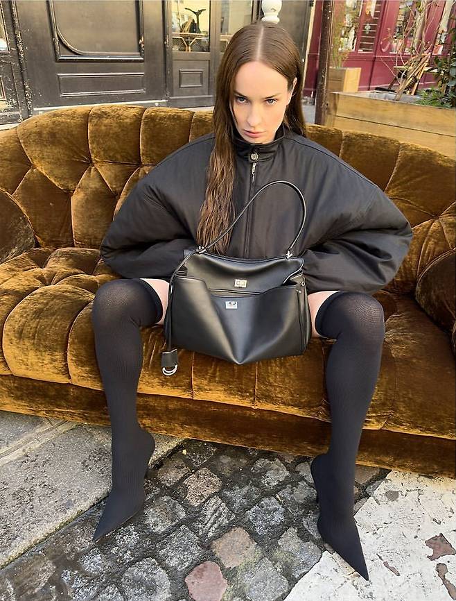 타이트한 터틀넥, 하이웨이스트 미니스커트,니삭스, 스텔레토힐, 발렌시아가 에어 캐리 백을믹스해 주었답니다.