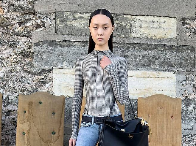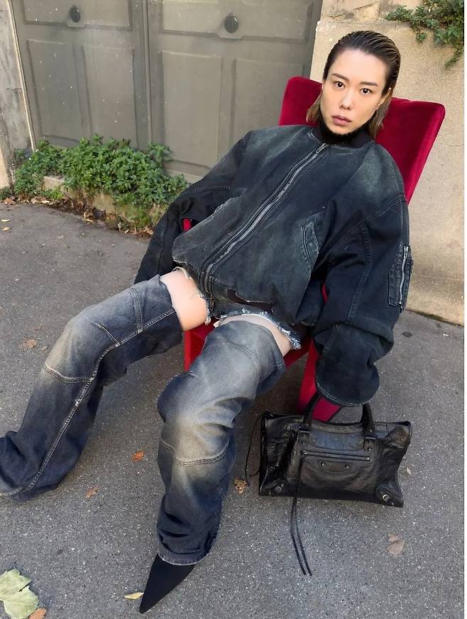 두 번째 화보에서 김예지는 찢어진 데님과 워싱 디테일이 돋보이는 오버사이즈