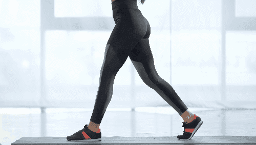 매트에 다리를 모으고 선 자세에서 시작합니다. 왼쪽 다리를 앞으로 내디디며 무릎을 90도로 구부려 런지 동작을 취하고, 손은 가슴 앞에서 모은 채 시선은 정면을 응시합니다. 반복한 뒤, 오른쪽 다리로 위치를 바꿔 같은 방식으로 반복합니다.
