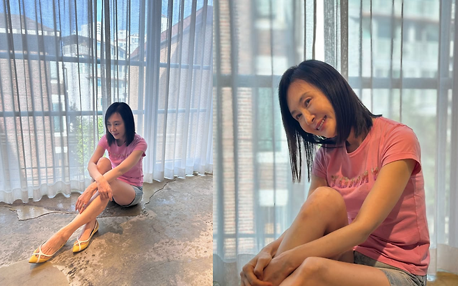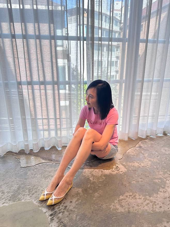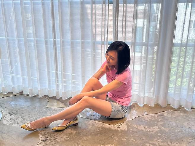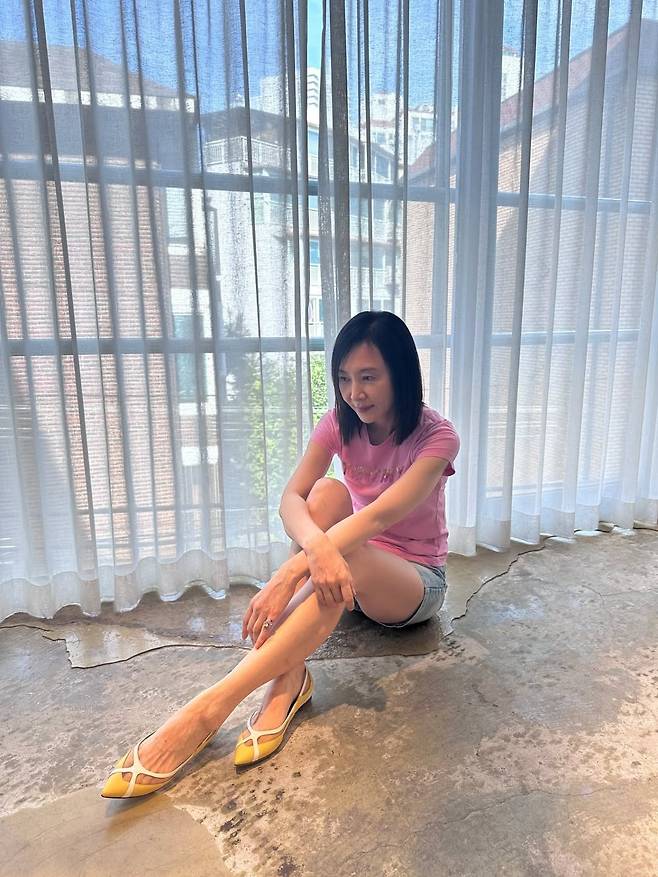 사진 속 채시라의 패션은 '애이지리스(Ageless) 캐주얼'의 정석이었습니다. 사랑스러운 핑크색 티셔츠와 경쾌한 데님 쇼츠는 20대라고 해도 믿을 만큼 젊은 감각을 보여줍니다.
