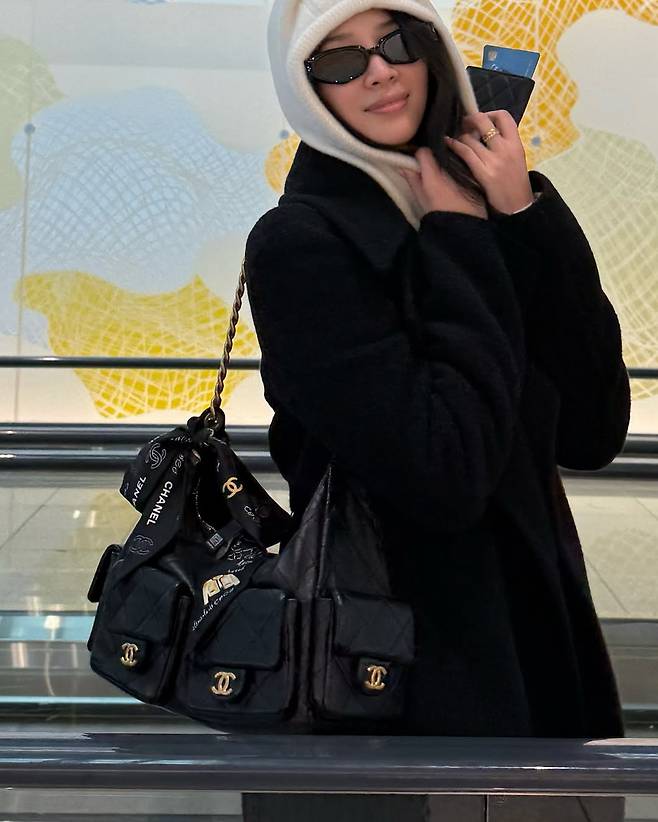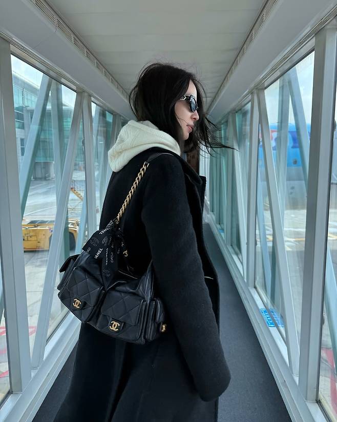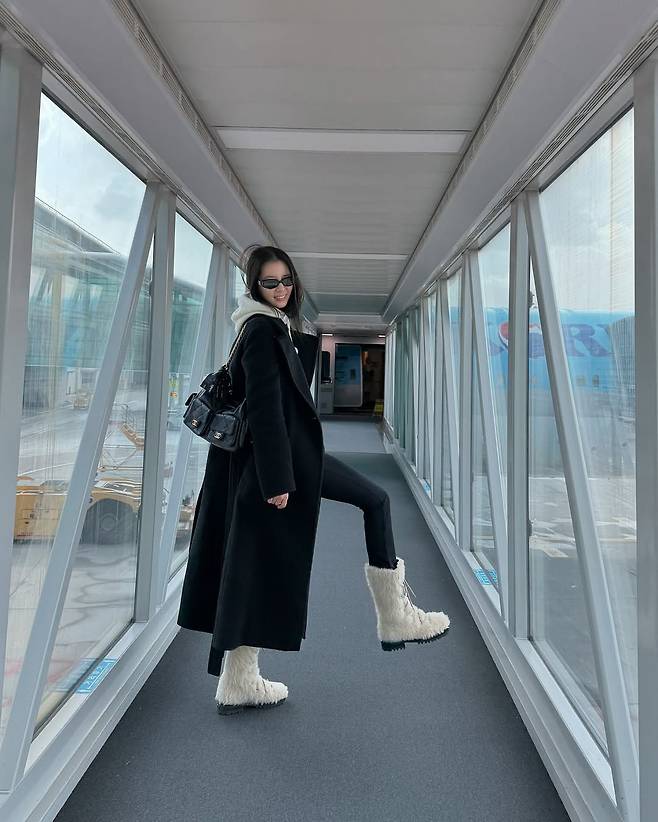 블랙 롱 코트, 니트 후드, 샤넬 라지 호보백 블랙, 선글라스, 화이트 롱 퍼 부츠를 매치해주었는데요.
