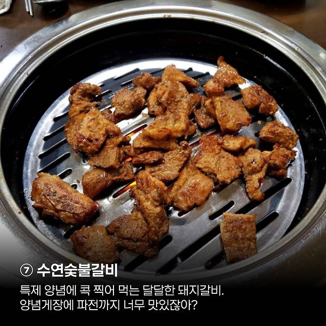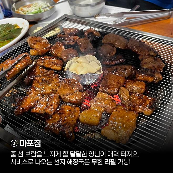 마늘향 가득한 숙성 양념이 자꾸만 생각나는 찐 노포 맛집. 새빨간 양념에 재웠지만 맵진 않은 신비의 돼갈! 껍데기와 열무비빔국수도 돼지갈비 만큼이나 유명하니 꼭 함께 드셔보시라고요~