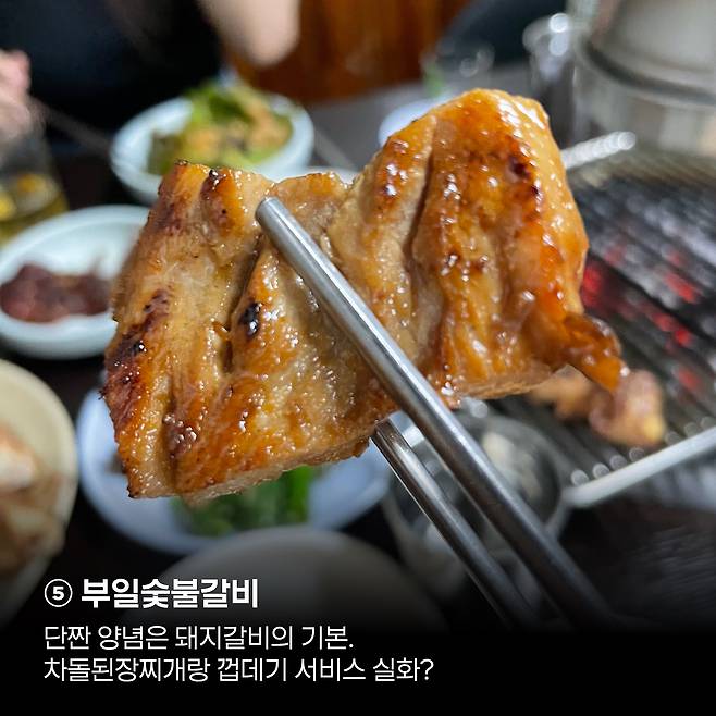 단짠단짠 돼지갈비의 정석. 고기를 시키면 차돌된장찌개와 껍데기가 서비스로 나오는 이 따뜻함 뭐지? 밑반찬이 맛있기로 유명하니 공기밥 2공 정도는 비울 준비 하고 가세요. 웨이팅 필