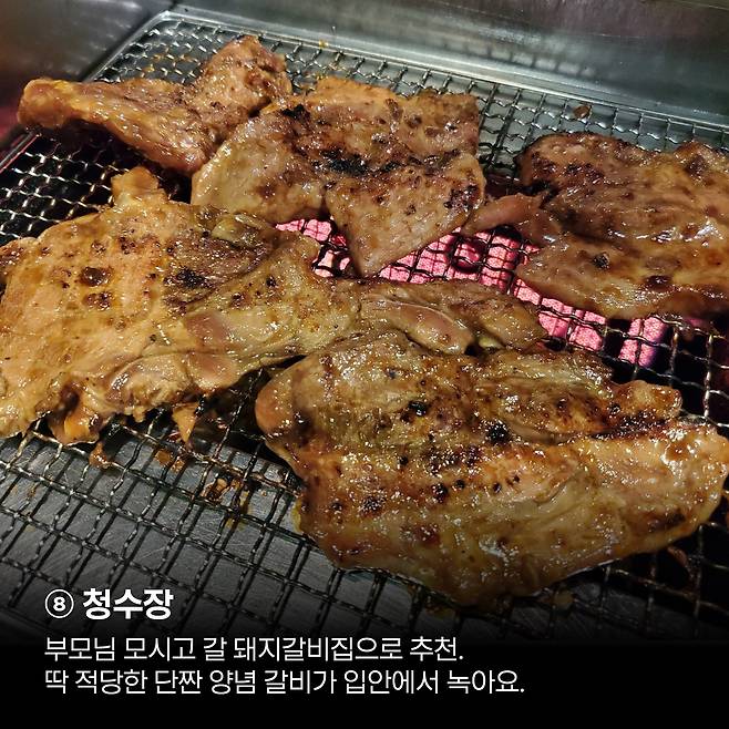 너무 달지도, 너무 짜지도 않은, 딱 적당한 갈비 양념과 부드러운 육질이 엄빠의 입맛까지 저격하는 곳. 갈비 먹고 난 뒤엔 목살도 꼭 잡숴봐~ 중요한 날엔 꼭 예약하고 가세요!