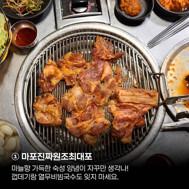 마늘향 가득한 숙성 양념이 자꾸만 생각나는 찐 노포 맛집. 새빨간 양념에 재웠지만 맵진 않은 신비의 돼갈! 껍데기와 열무비빔국수도 돼지갈비 만큼이나 유명하니 꼭 함께 드셔보시라고요~