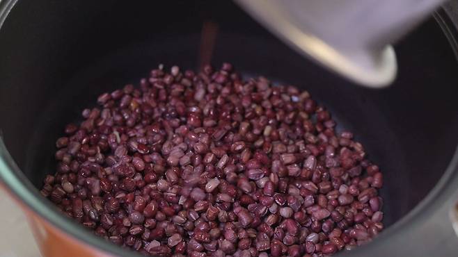 4) 물 500ml, 팥을 냄비에 넣고 '강불'에서 끓여 주세요.