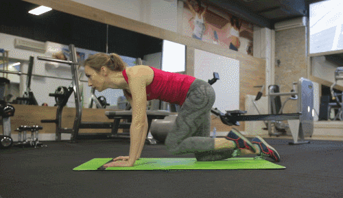 매트 위에서 손과 무릎을 대고 네발기기 자세를 만듭니다. 왼쪽 다리를 뒤로 곧게 뻗고, 무릎을 완전히 펴며 발끝까지 길게 뻗어줍니다. 다리를 가슴 쪽으로 당겼다가 다시 뒤로 뻗는 동작을 반복합니다.