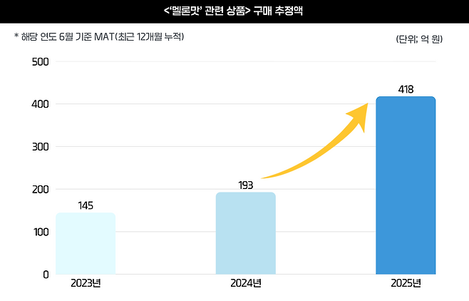 엠브레인 딥데이터의 구매 트렌드 분석에 따르면, ‘멜론맛’을 접목한 상품군이 유통업계에서 빠르게 존재감을 넓혀가고 있는 것으로 확인됐다. 우선, 2025년 6월 기준 최근 1년간(MAT) 대형마트 및 편의점 등에서 판매된 ‘멜론맛’ 관련 상품의 구매 추정액은 418억 원으로, 전년 동기 대비 116.5% 증가한 것으로 나타났다. 2023년 동일 기준 구매액(145억 원)과 비교하면 2년 연속 큰 폭의 성장세다.