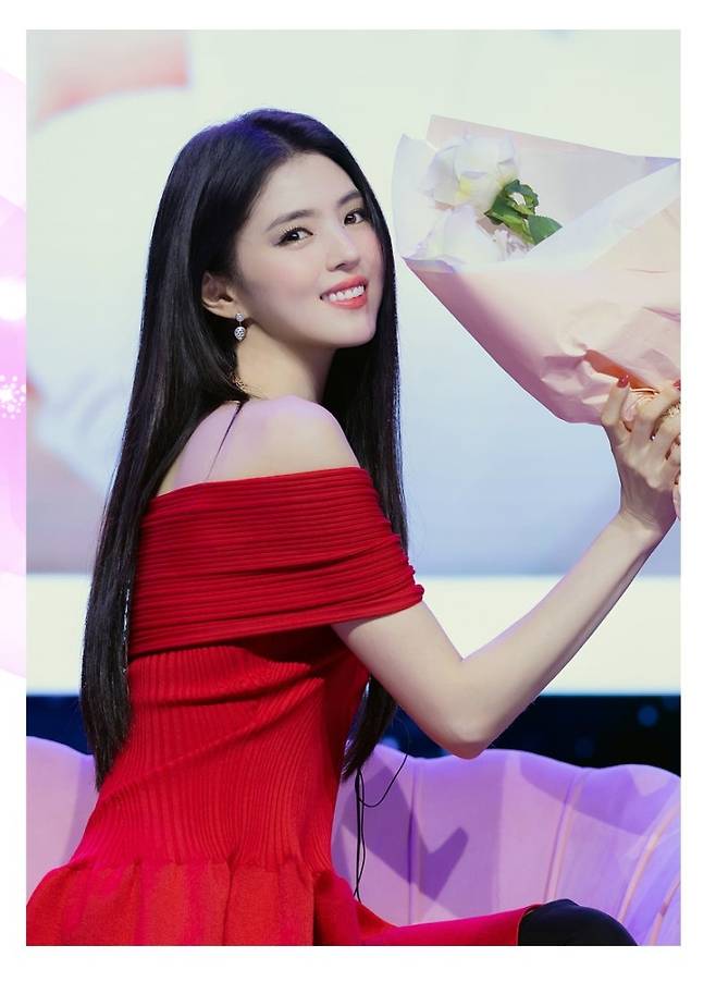 공항패션에서는 올블랙으로 시크함을 강조했다면, 팬미팅에서는 레드 컬러를 활용하여 더욱 화려하고 매혹적인 분위기를 연출한 한소희 씨. 투명하게 빛나는 그녀의 피부는 어떤 스타일도 완벽하게 소화하며 감탄을 자아냅니다.