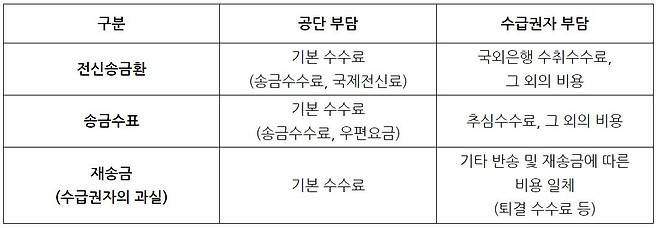 ※기본 수수료는 공단이 부담하고 있으나, 중계은행과 수취은행 수취수수료는 수급권자가 부담합니다. (단, 인도화폐는 이종통화 수수료를 신청자가 부담)