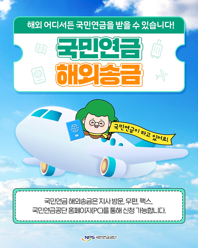 국민연금 해외송금 신청은 국민연금공단 지사를 방문하여 신청하시거나 우편, 팩스, 국민연금공단 홈페이지(PC)를 통해 신청하실 수 있습니다!