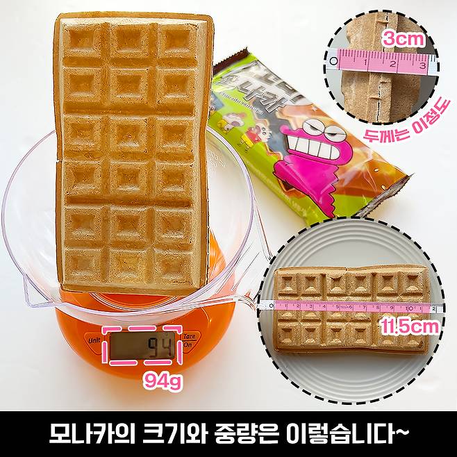 모나카의 중량은 94g, 길이와 두께는 각각 11cm, 3cm입니다. 시중에서 쉽게 찾고 먹을 수 있는 아이스크림의 크기에요! 나눠 먹기 좋게 선이 그어져 있는 게 모나카의 매력인 것 같아요.
