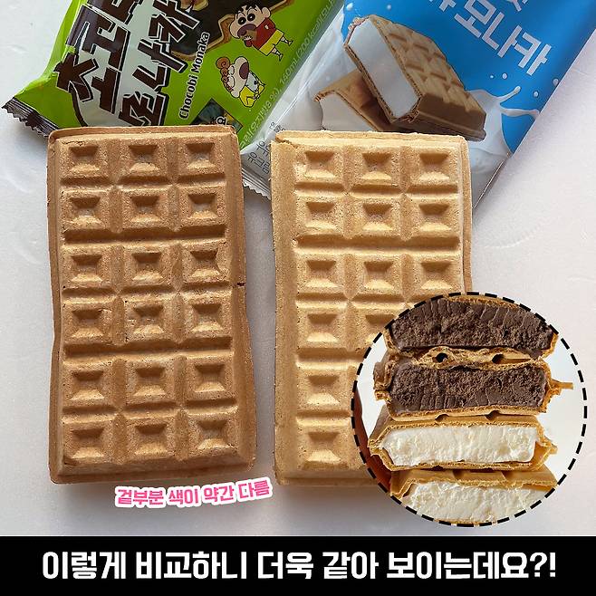 한 사진에 담겨있는 모나카를 보니 저는 겉에 빵 부분의 색도 같을 줄 알았는데 초코비 모나카가 더 진하네요! 크기나 두께는 비슷하죠?(^^)