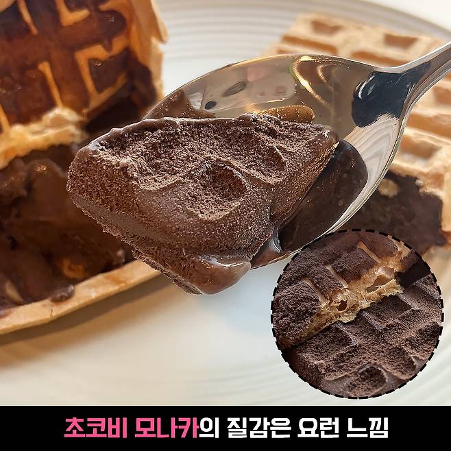 모나카와 찰~싹 붙어있던 초코 아이스크림을 숟가락으로 퍼 봤습니다! 초코 향이 뿜뿜 나는 게 바로 입으로 직진 안 할 수 없음 ㅎ