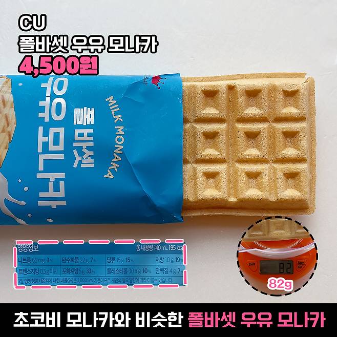 이대로 끝내긴 아쉬웠는데 글쎄 편의점에 다른 모나카가 파는 거예요. 이건 우유맛 모나카인데 글쎄 이거 가격도 4,500원.. 주르륵. 중량은 82g으로 초코비 모나카보다 적게 나가네요.