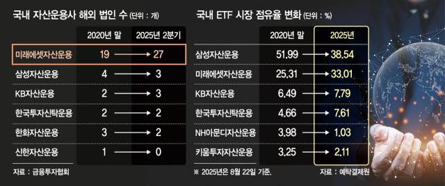 금융 당국이 국내 금융 회사들의 해외 진출을 적극적으로 장려하고 있지만 국내 자산운용사들의 성적은 부진한 상황이다. 금융투자협회 공시에 따르면 올 2분기 기준으로 2020년 말보다 해외 법인 수가 늘어난 국내 자산운용사는 미래에셋자산운용과 KB자산운용 뿐이다. 연내 현지 법인 청산 계획을 밝힌 KB자산운용을 제외하면 사실상 미래에셋자산운용이 유일하다. 미래에셋자산운용의 현지 법인 수는 27개로 2위인 삼성자산운용(3개)을 압도적으로 따돌렸다. 신한자산운용의 경우 지난해 홍콩 법인을 본사로 흡수 통합하며 해외 법인 수가 전무했다. 업계 관계자는 “냉정하게 말하면 현재 세계 시장에서 성과를 내고 있는 건 미래에셋자산운용 뿐"이라고 지적했다.