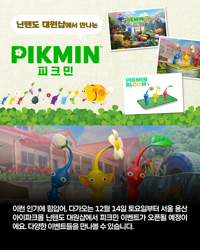 이런 인기에 힘입어, 12월 14일 토요일부터 서울 용산 아이파크몰 닌텐도 대원샵에서 피크민 이벤트가 진행됩니다. 다양한 이벤트들을 만나볼 수 있습니다.대형 피크민 피규어와 함께 사진 촬영이 가능한 포토존, ‘피크민 4’ 게임 체험 공간, 피크민과 함께 AR 사진 촬영, 매장 구매 특전, 이 곳에서만 구할수 있는 특별한 디자인의 데코피크민 배포까지.