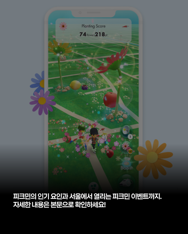 2021년, 피크민 시리즈의 20주년을 기념하여 스마트폰 증강현실 모바일 게임 ‘피크민 블룸’이 출시되었어요. 스마트폰을 들고 산책하면서 피크민 모종을 찾아 심으면서 캐릭터를 키우고 꾸미는 게임인데요. 몇년 전 전세계를 강타했던 ‘포켓몬 고’와 동일한 장르이죠. 그럼 3년 전에 출시된 게임이 왜 이제서야 흥행하게 된 걸까요?