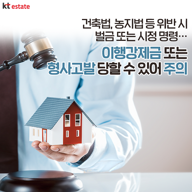 보통 위반 시 시정 명령 → 이행강제금(또는 형사 고발) 순으로 진행되는데, 시정 명령이 나왔을 때 원상 복구 후 행정기관에 신고하면 이행강제금 부과 등 큰 문제는 없다고 알려졌습니다. 만일 이행강제금을 내지 않는다면 행정기관에서 행정대집행(행정기관에서 명령 집행을 한 뒤 비용을 법적 의무자에게 부담시키는 것) 또는 재산 압류를 할 수 있습니다.