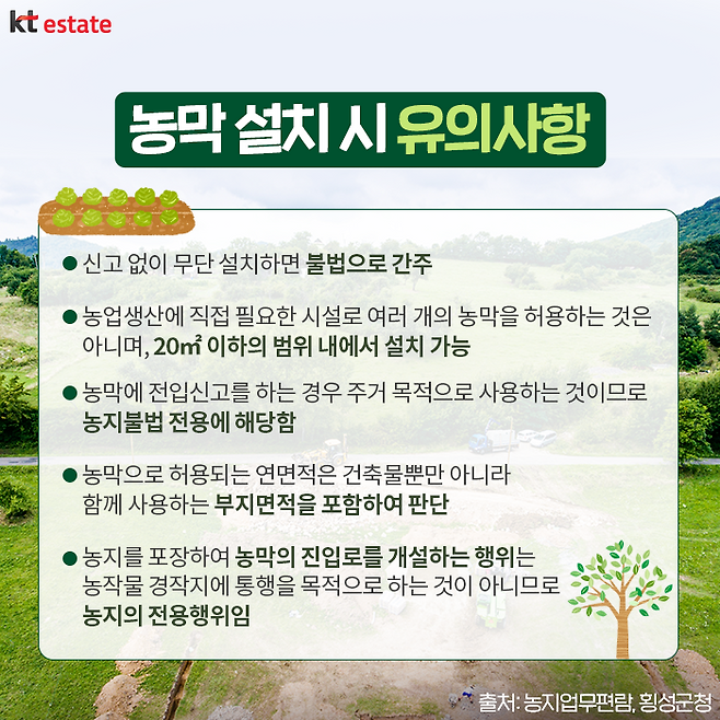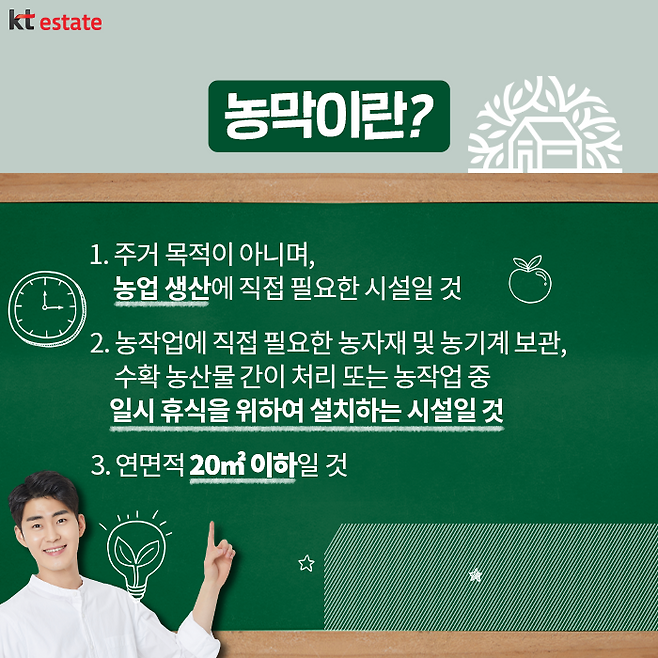 단, 농막 신고 시 다음의 요건을 맞춰야 설치가 가능한데요. 농지법 시행규칙 제3조의2에 따르면 농막은 주거 목적이 아니어야 하며, 연면적 20㎡(약 6평) 이하이고, 농작업에 직접 필요한 농자재 및 농기계 보관, 수확 농산물 간이 처리 또는 농작업 중 일시 휴식을 위하여 설치하는 시설이어야 합니다.