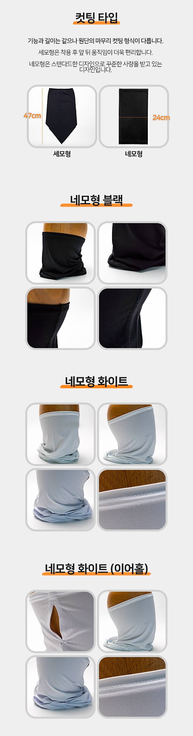 마스크, 목폴라, 등부분, 모자형, 두건스타일, 헤어밴드형, 팔꿈치 보호대, 손목밴드 등 다양하게 코디하여 활용이 가능!