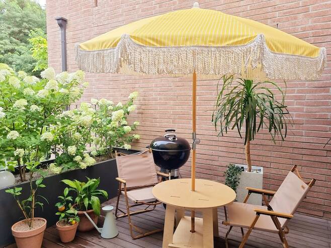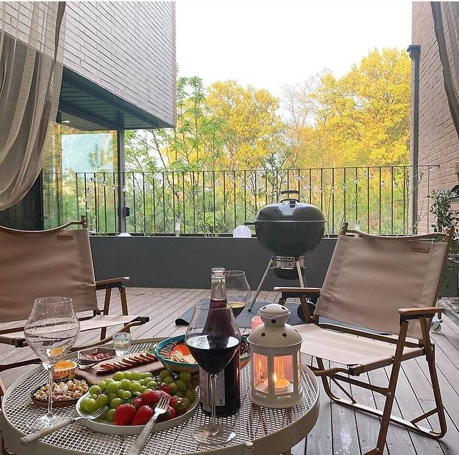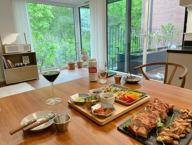 주말에는 종종 지인들을 초대해 함께 시간을 보내고 있어요. 지인들은 식탁에 앉아 뷰를 보면서 펜션에 놀러 온 것 같다는 얘기를 많이 해주세요. 저희 집 대표 메뉴는 남편의 훈연 BBQ입니다. 하루 전에 미리 숙성시킨 고기를 테라스에서 그릴에 구워 대접하고 있어요. 남편의 BBQ 실력이 일취월장하고 있답니다.