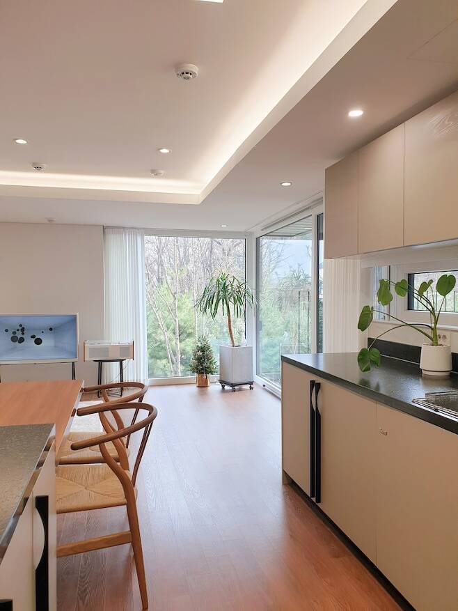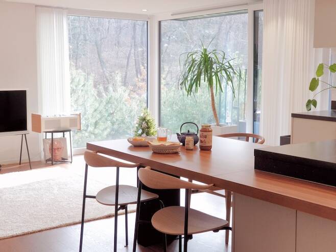 거실이 저희 부부의 온전한 쉼의 공간이 되어주길 바랐어요. 자연, 아늑함, 따뜻함이 떠올랐고 이 집에 처음 들어섰을 때 거실을 보고 그런 환경을 갖춘 집이라는 확신이 들었어요. 단지가 작은 산으로 둘러싸여 있고, 거실 창문이 산과 가깝게 닿아 있는 덕분이지요. 이 집을 선택하게 된 가장 큰 이유이기도 해요. 통창을 통해 자연을 집안으로 들이고 가까이에서 느끼며 살고 있답니다.