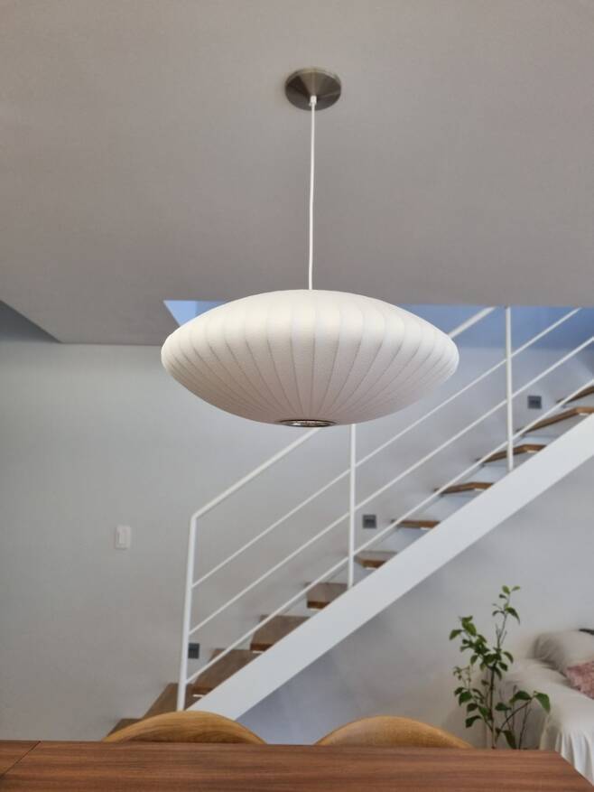 허먼밀러의 버블 램프가 저희 집 분위기와 잘 어울리는 것 같아요. 저희 집 식탁은 폭이 넓다 보니 백화점에서 미디엄 사이즈를 추천받아 구입했습니다. 보통 4인용 식탁에는 스몰, 6인용 식탁에는 미디엄 사이즈를 추천하신다고 하셨어요.