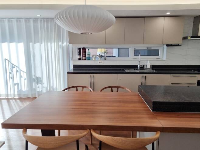 현관에 들어서면 거실 뷰 다음으로 주방으로 시선이 닿아요. 거실과 주방이 연결되어 있는 구조입니다. 두 공간의 경계가 없다 보니, 자연스럽게 저보다 남편이 주방에 있는 시간이 많아졌네요. 참 바람직한 변화죠.
