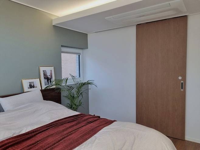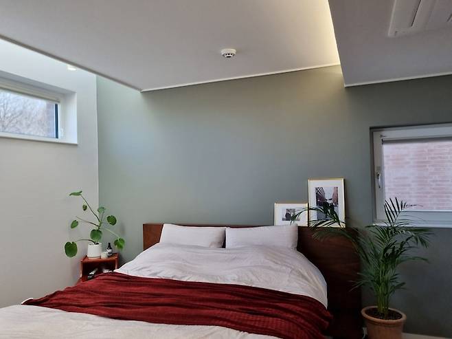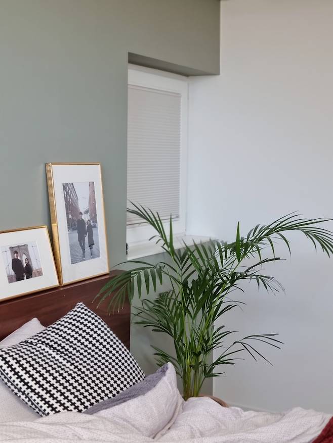 침실은 숙면을 위한 목적에만 집중한 공간이에요. 키가 큰 남편에게 맞춘 CK 사이즈의 침대가 방안을 꽉 채우고 있습니다. 침대 헤드 쪽 벽면은 올리브색 포인트 벽지로 꾸몄어요. 침대 양쪽에는 공기정화식물인 이레카야자와 몬스테라 화분을 두었습니다.