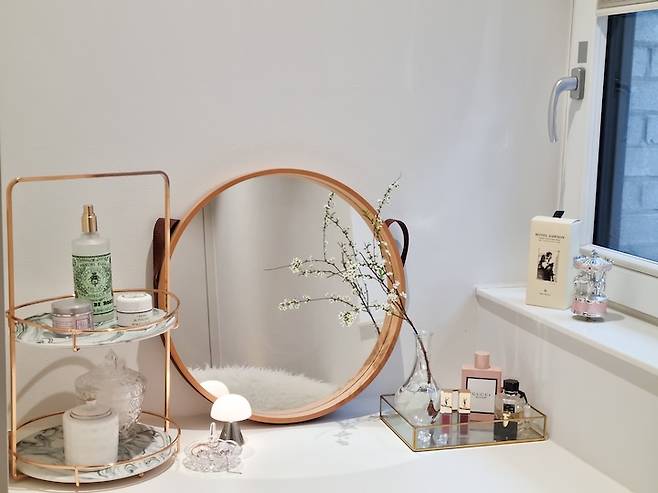 화장대에는 물건을 많이 꺼내놓지 않아요. 화장품이 많지 않아 하단 서랍장에 수납해놓고 사용합니다.