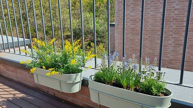 B 타입의 가장 큰 특징은 2층 테라스가 4층의 테라스보다 넓다는 점입니다. 2층 테라스가 주방과 연결되어 있어 활용도가 높고 넓게 쓸 수 있어 B 타입을 선택했어요. 2층 테라스에는 가로로 긴 화단이 갖춰져 있고, 가제보와 야외 창고를 설치했습니다.