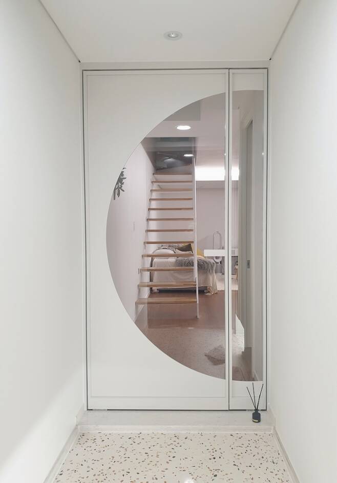 집의 구조 상, 현관문을 열면 바로 밖과 연결되기 때문에 중문은 보온 유지를 위해 필수 요소였습니다. 반달 모양의 중문이 정면으로 보이는 계단 구조의 매력을 살리고, 거실 공간의 시선을 확장시켜주는 효과를 주었어요. 문은 양방향으로 모두 열리는 양개 도어라서 짐을 갖고 드나들기 편리해요. 인테리어 사장님께서 이 중문으로 시공한 집은 저희가 처음이라고 하셨어요. 저도 너무 마음에 들고 집에 오신 지인들도 디자인이 독특하다며 칭찬을 많이 해주셨어요.