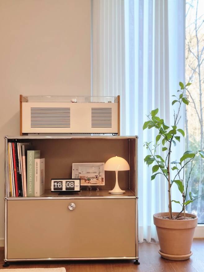 턴테이블을 안정감 있게 놓고 사용할 수납장을 고민하다가 USM의 모듈 가구를 백화점에서 구입했습니다. 우드 소재와의 조화를 위해 베이지 색상을 선택했어요. 매장에서 봤을 때보다 집에 들여놓았을 때 생각보다 부피가 커서 깜짝 놀랐었어요.