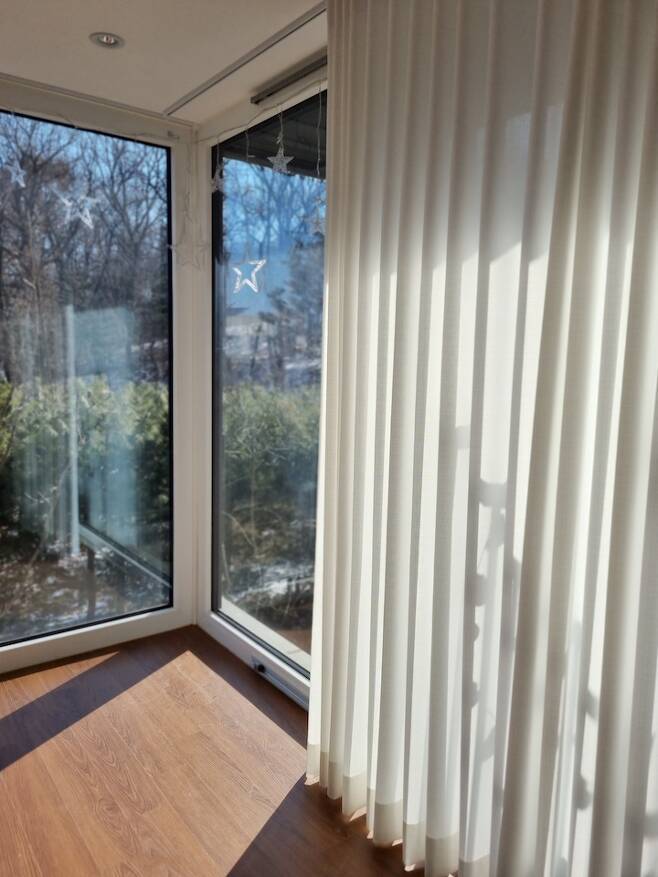 커튼은 커튼명가창에서 두꺼운 린넨 소재에 주름 작업을 추가해서 제작했어요. 처음에는 실크 소재의 커튼을 생각했었는데, 커튼집 사장님께서 주변에 산이 있기 때문에 어둠이 새어 들어오는 것을 막으려면 두꺼운 소재로 맞춰야 한다고 하시더라고요. 미쳐 생각하지 못했던 부분이었어요. 조언 덕분에 바깥 시선을 차단하고 보온 효과를 높이는 커튼으로 알맞게 제작할 수 있었습니다.