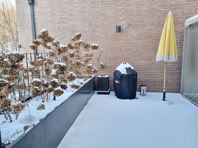 겨울이 되니 꽃송이는 갈색으로 변했지만, 꽃송이 위에 눈이 내려 앉은 모습도 나름 운치가 있더라고요. 이제 봄이 오기 전에 가지치기를 해주려고 해요. 지난 해, 예쁜 꽃을 피웠던 수국이 올 겨울 매서운 한파에도 끝까지 잘 견뎌주고 맞이할 따뜻한 봄에는 건강한 초록잎을 피워주길 바라고 있습니다.