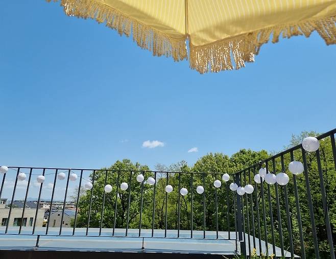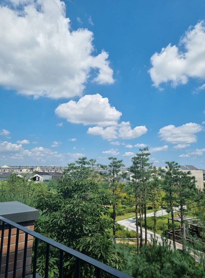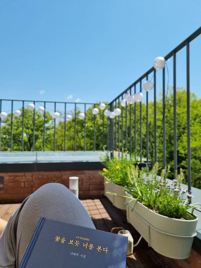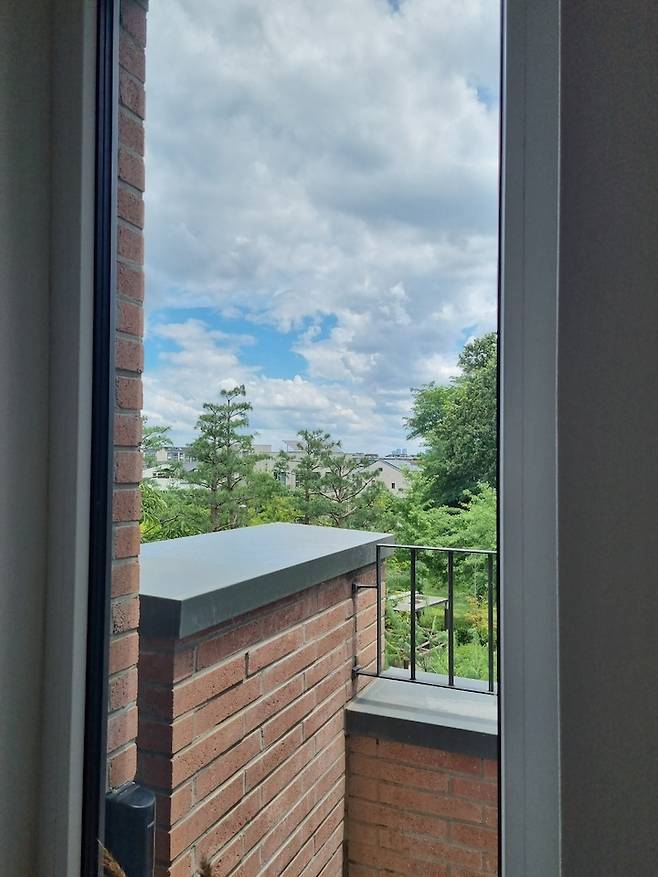 테라스에서 내려다보는 동네 풍경이에요. 높은 건물이 없어 전망이 탁 트여 있고, 저 멀리 한강이 빼꼼히 보여요. 요즘 같은 시기에 개인적인 공간에서 바깥 공기를 온전히 맡을 수 있음에 감사함을 느끼고 있답니다.