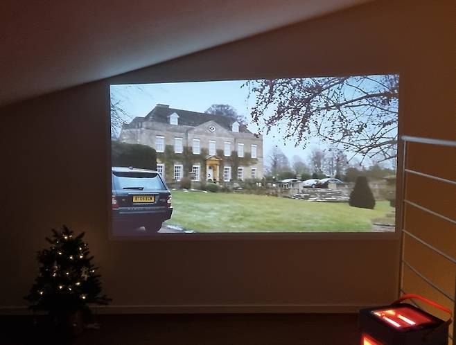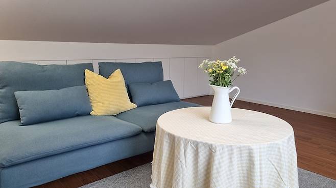다락방 벽을 스크린으로 활용해 영화를 즐겨 보기도 해요. 전기난로를 켜고 담요를 두르면 제법 운치 있고 따뜻하게 지낼 수 있어요.