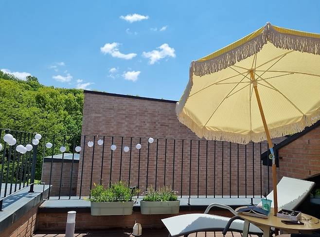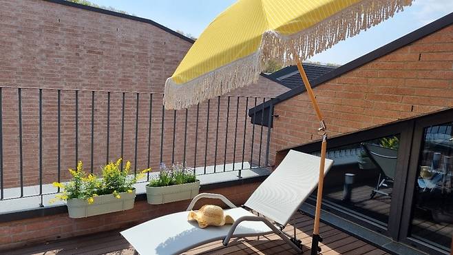 4층 테라스는 정남향으로 따뜻하게 시간 보내기 좋아요. 쾌청한 주말에 선베드에 누워 책을 읽거나 낮잠을 자는 시간이 이 집에서 가장 행복한 순간 중에 하나인 것 같아요.