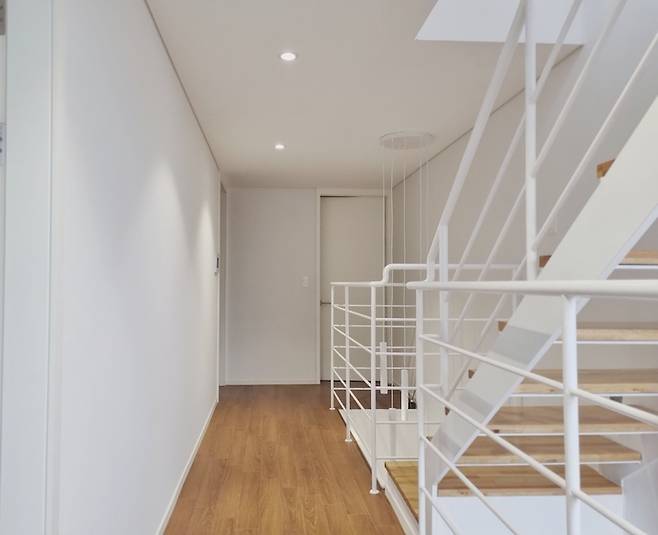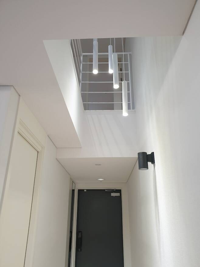 현관에 들어서면 3층의 천장 조명이 보이는 구조에요. 실내 전용면적을 맞추기 위해 뚫려있는 3층 공간에 5개의 조명을 설치해 현관에 들어섰을 때 보이도록 했습니다.