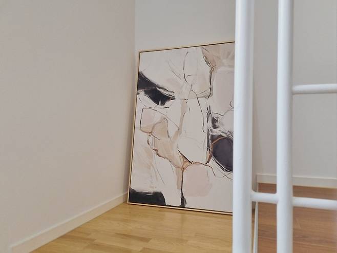 복도에 놓여있는 유일한 액자에요. 벽지에 조명이 닿았을 때의 따뜻한 느낌이 좋아서 액자를 걸지 않았어요.
