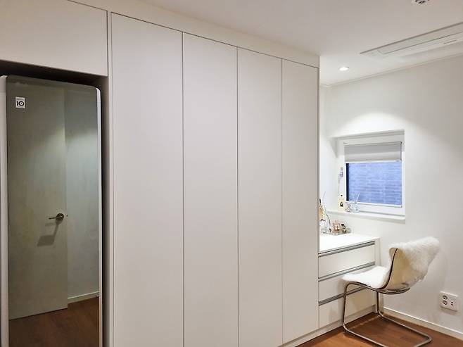 작은방은 저의 드레스룸으로 쓰고 있어요. 특별할 것 없는 공간이지요. 신혼 때 구입한 스타일러와 창문의 위치, 동선을 고려하여 붙박이장을 제작했습니다. 드레스룸에는 관리의 편의, 깔끔함을 위해 무조건 문이 달린 장을 설치해야 한다는 주의에요. 붙박이장 샘플에는 손잡이가 있었는데, 깔끔하고 유행 타지 않는 장을 위해 손잡이를 제외하고 제작했어요. 창문이 있어 오른쪽은 낮은 서랍장을 만들고 위에는 화장대로 쓰고 있습니다.