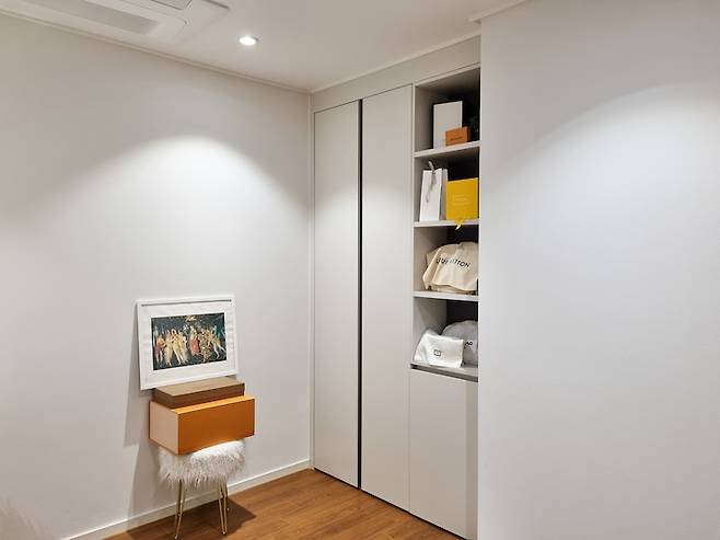 화장대 맞은편의 붙박이장은 기본 옵션으로 설치되어 있었고, 주로 긴 외투를 보관하고 있습니다. 한 켠에 있는 그림은 보티첼리의 '프리마베라'이죠. 피렌체의 우피치 미술관에서 구입했어요. 프리마베라를 보고는 우아함에 넋을 잃고 한참을 들여다봤던 기억이 있어요.