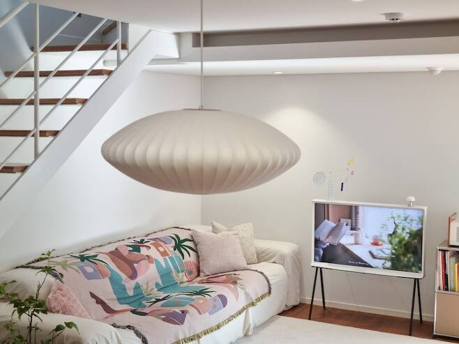 49인치 TV는 친정 부모님께서 이사 기념으로 선물해 주셨어요. 이동성, 디자인적 부분에서 매우 만족스러워요. 첫 신혼집에서 썼던 65인치 벽걸이 TV는 거실에 어울리지 않아, 침실에 배치해두었어요. 심심한 벽은 그림 대신 모빌과 미니 조명으로 채웠습니다. 깨끗한 벽을 여백으로 남겨 놓고 싶었어요. 모빌은 볼타 모빌의 여러 시리즈 중에 '시드니'입니다.