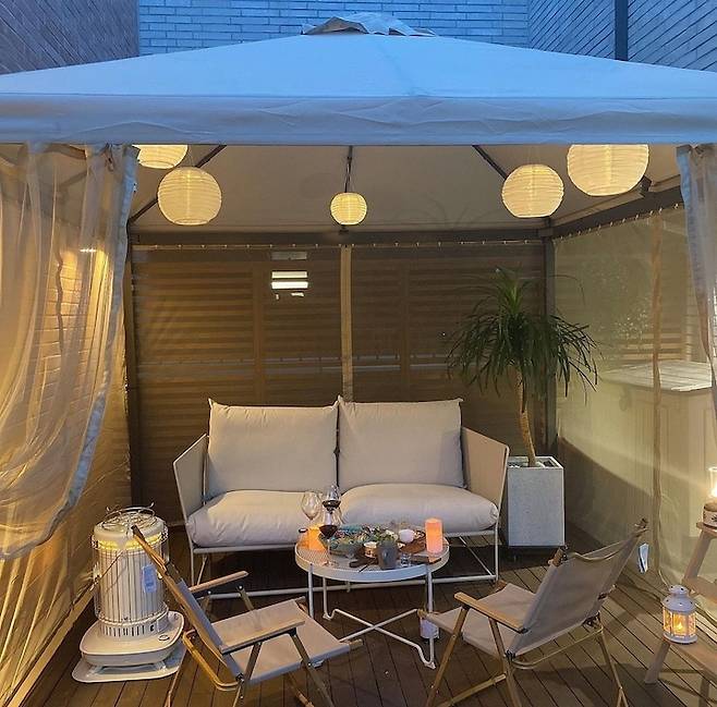 햇살 좋은 날 테라스에서 낮잠 자는 모습을 상상하며 가제보를 설치했어요. 가제보, 소파, 테이블, 조명은 이케아의 제품으로 꾸몄습니다. 이케아의 오프라인 쇼룸이 테라스 제품으로 잘 꾸며져 있어 참고하기 좋았어요.