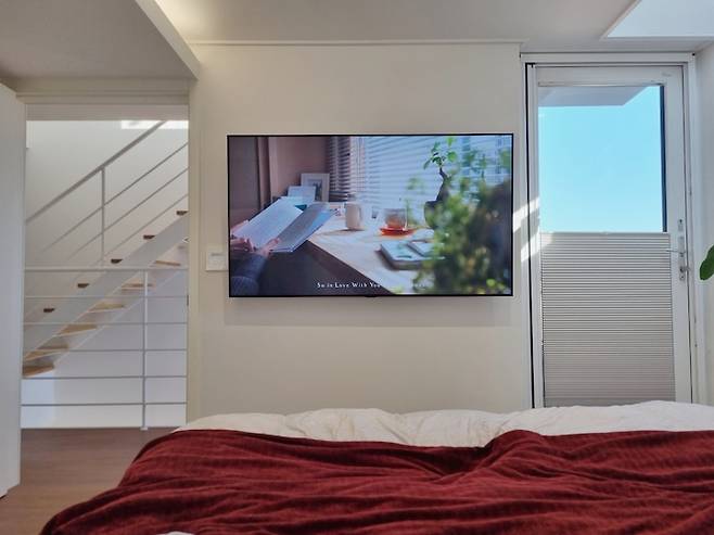 침대 맞은편 모습이에요. 이전 신혼집에서 쓰던 65인치 TV가 침실 벽면을 가득 채우고 있어요. 밤에 영화를 볼 때면 빔 프로젝터의 스크린 같은 느낌이 나요.